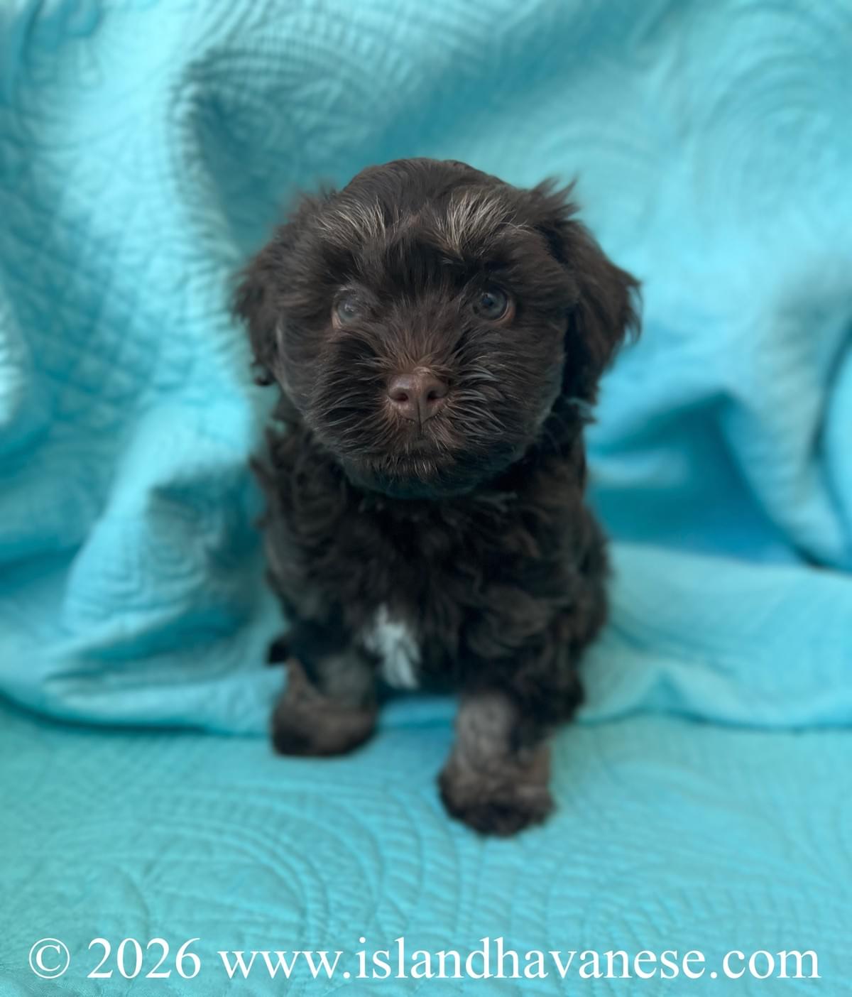 Chocolate and white Havanese white chin, white collar, white tip on tail, white feet.
